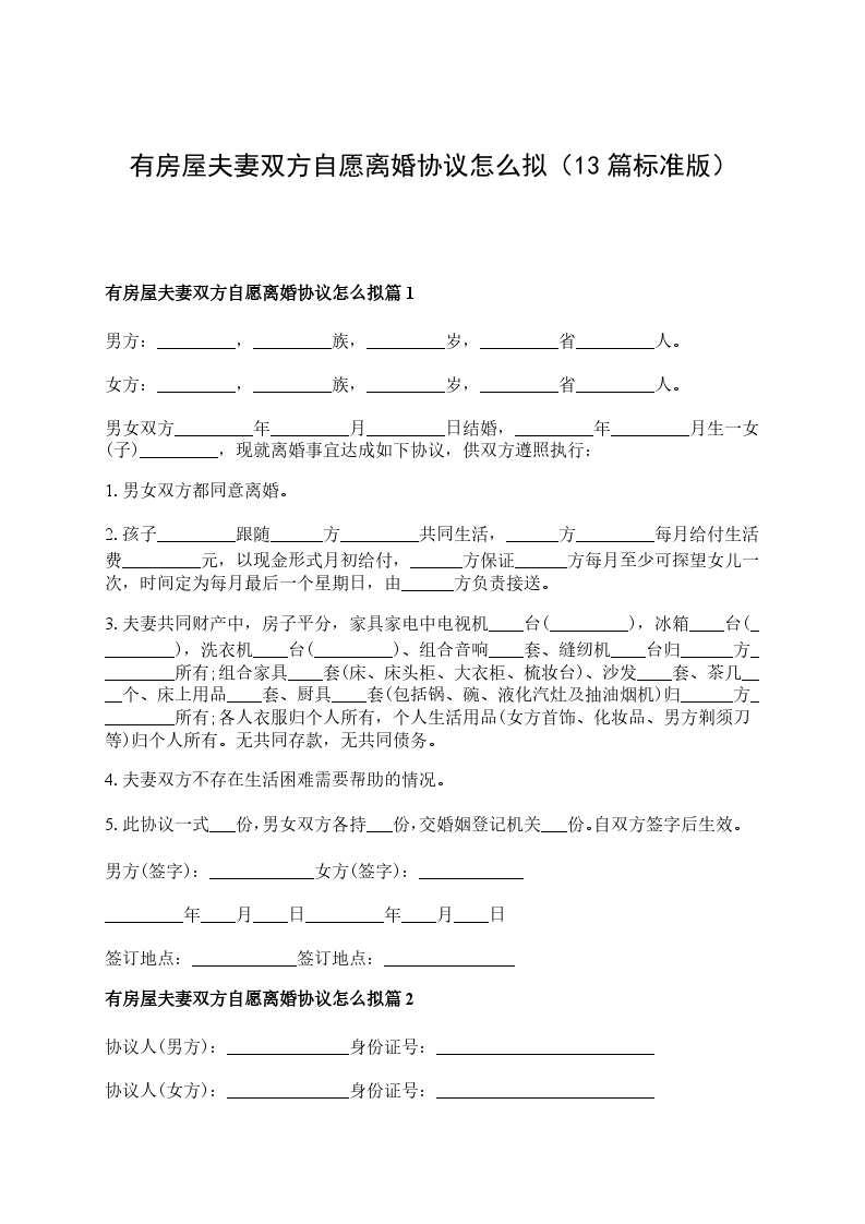 (1)夫妻婚后共有房屋坐落在__________________住房一套。现协商该套房产归______方所有,______方同意在办理完离婚手续后配合______方办理产权变更手续。
