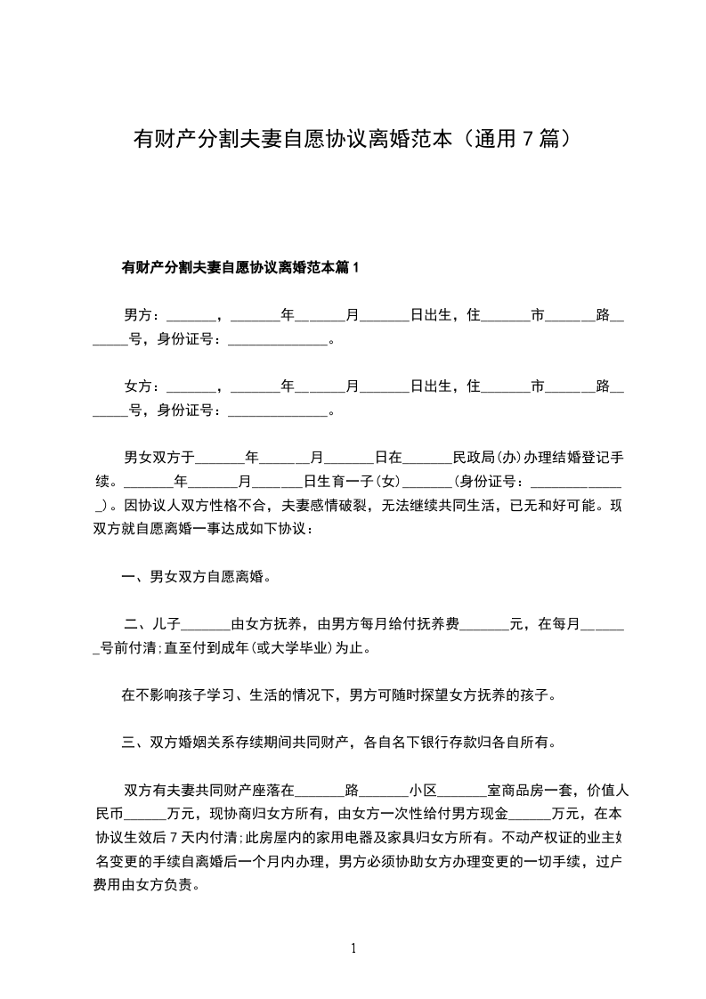 有财产分割夫妻自愿协议离婚范本篇1