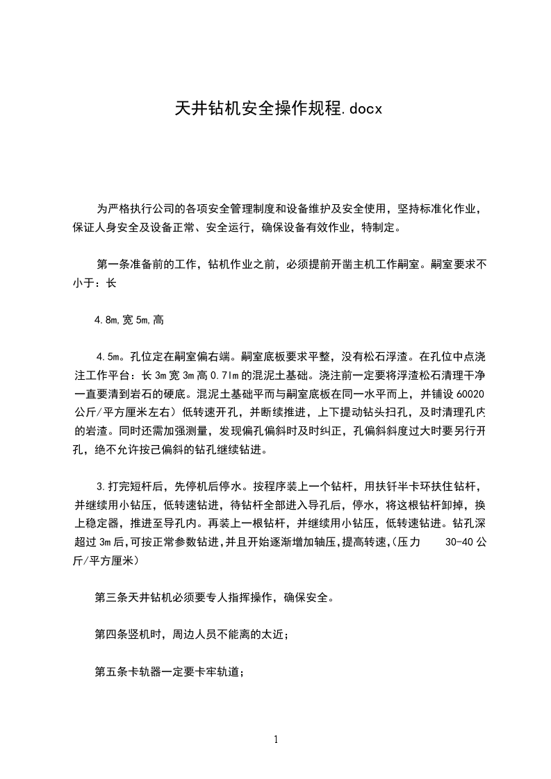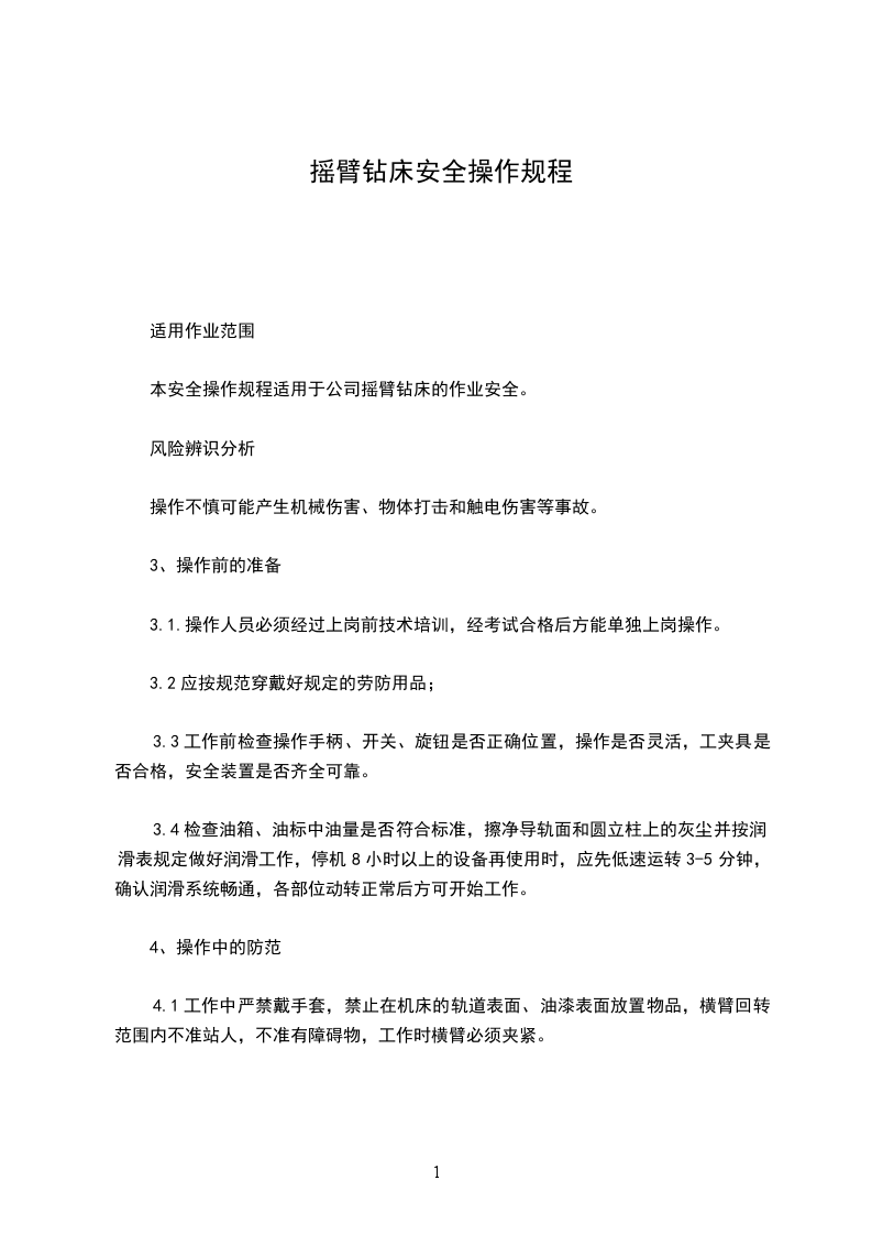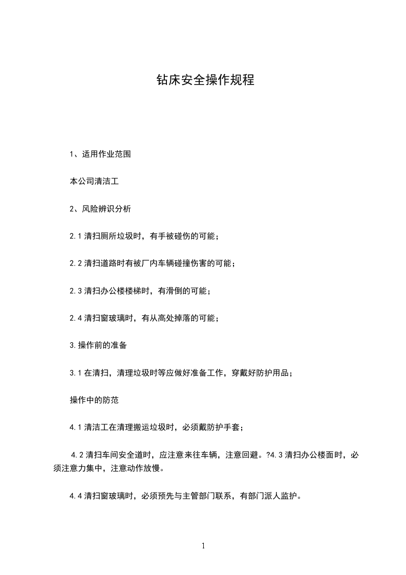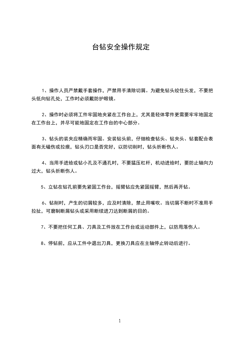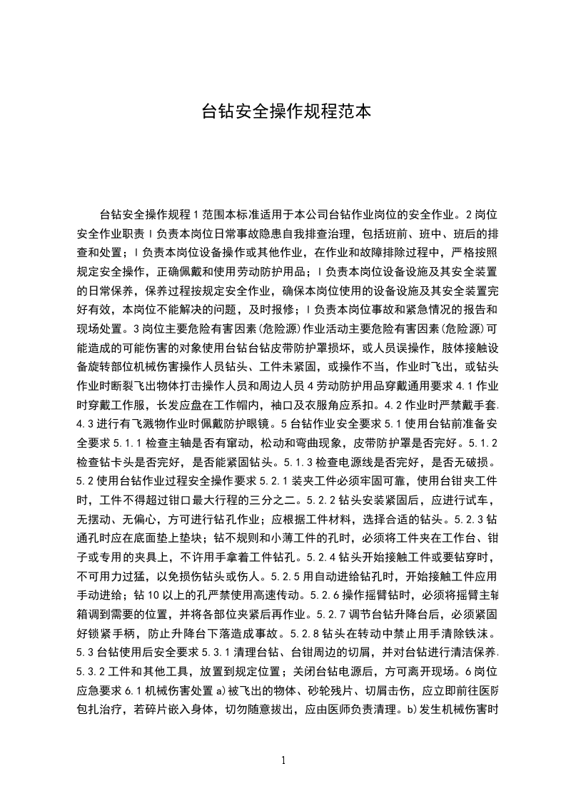 台钻安全操作规程1范围本标准适用于本公司台钻作业岗位的安全作业。2岗位安全作业职责l负责本岗位日常事故隐患自我排查治理,包括班前、班中、班后的排查和处置;l负责本岗位设备操作或其他作业,在作业和故障排除过程中,严格按照规定安全操作,正确佩戴和使用劳动防护用品;l负责本岗位设备设施及其安全装置的日常保养,保养过程按规定安全作业,确保本岗位使用的设备设施及其安全装置完好有效,本岗位不能解决的问题,及时报修;l负责本岗位事故和紧急情况的报告和现场处置。3岗位主要危险有害因素(危险源)作业活动主要危险有害因素(危险源)可能造成的可能伤害的对象使用台钻台钻皮带防护罩损坏,或人员误操作,肢体接触设备旋转部位机械伤害操作人员钻头、工件未紧固,或操作不当,作业时飞出,或钻头作业时断裂飞出物体打击操作人员和周边人员4劳动防护用品穿戴通用要求4.1作业时穿戴工作服,长发应盘在工作帽内,袖口及衣服角应系扣。4.2作业时严禁戴手套。4.3进行有飞溅物作业时佩戴防护眼镜。5台钻作业安全要求5.1使用台钻前准备安全要求5.1.1检查主轴是否有窜动,松动和弯曲现象,皮带防护罩是否完好。5.1.2检查钻卡头是否完好,是否能紧固钻头。5.1.3检查电源线是否完好,是否无破损。5.2使用台钻作业过程安全操作要求5.2.1装夹工件必须牢固可靠,使用台钳夹工件时,工件不得超过钳口最大行程的三分之二。5.2.2钻头安装紧固后,应进行试车,无摆动、无偏心,方可进行钻孔作业;应根据工件材料,选择合适的钻头。5.2.3钻通孔时应在底面垫上垫块;钻不规则和小薄工件的孔时,必须将工件夹在工作台、钳子或专用的夹具上,不许用手拿着工件钻孔。5.2.4钻头开始接触工件或要钻穿时,不可用力过猛,以免损伤钻头或伤人。5.2.5用自动进给钻孔时,开始接触工件应用手动进给;钻10以上的孔严禁使用高速传动。5.2.6操作摇臂钻时,必须将摇臂主轴箱调到需要的位置,并将各部位夹紧后再作业。5.2.7调节台钻升降台后,必须紧固好锁紧手柄,防止升降台下落造成事故。5.2.8钻头在转动中禁止用手清除铁沫。5.3台钻使用后安全要求5.3.1清理台钻、台钳周边的切屑,并对台钻进行清洁保养。5.3.2工件和其他工具,放置到规定位置;关闭台钻电源后,方可离开现场。6岗位应急要求6.1机械伤害处置a)被飞出的物体、砂轮残片、切屑击伤,应立即前往医院包扎治疗,若碎片嵌入身体,切勿随意拔出,应由医师负责清理。b)发生机械伤害时,应立即进行包扎、止血等处理,防止感染;严重的应立即到医院处置。6.2发生设备、工具漏电时,应立即关闭设备配电柜电源;如发生人员触电,不得用肢体接触触电者,首先应关闭电源,来不及关闭时,应使用绝缘物体将带电物挑开。6.3维修组区域内发生火险时,应立即使用周边的灭火器进行灭火并同时报告车间当班带班人员;处置无效时立即撤离现场,按现场疏散指示标识到工厂大门处集合。6.4在生产现场维修作业时,现场发生火险,应立即停止作业,听从所在部门应急指挥,按所在现场的疏散指示标识和规定的集合地进行疏散集中