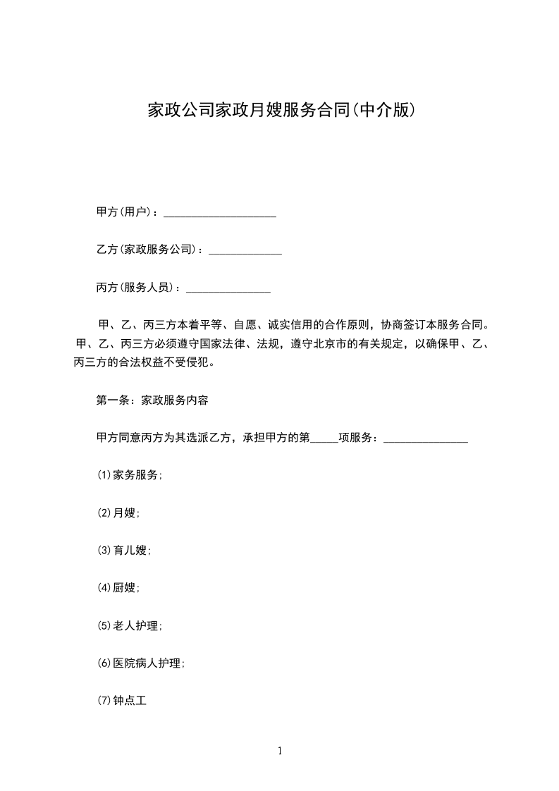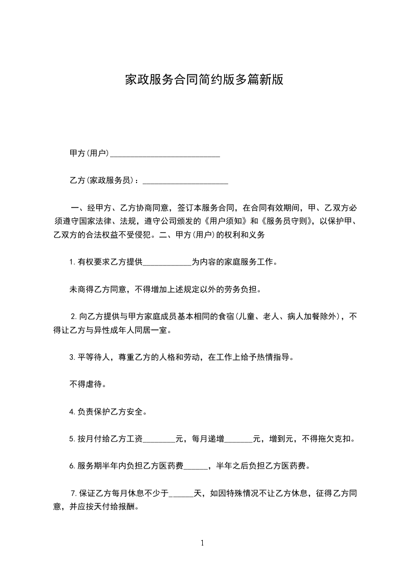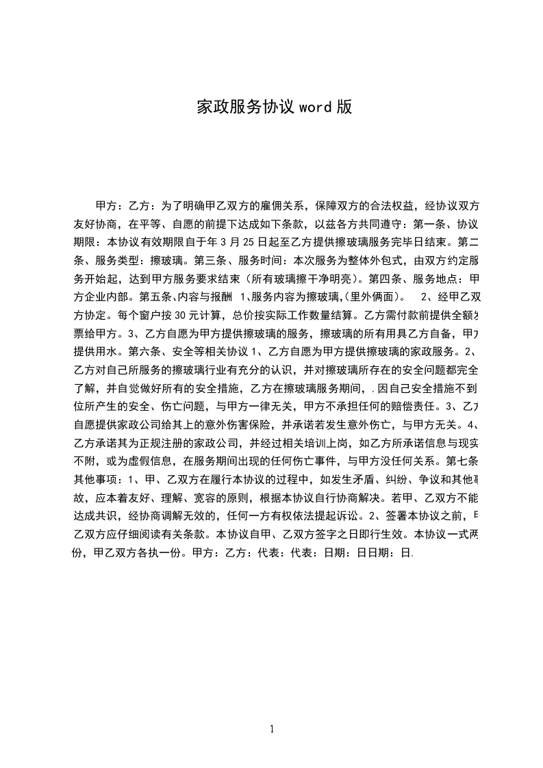 1.自愿为甲方提供_______________为内容的家庭服务工作。