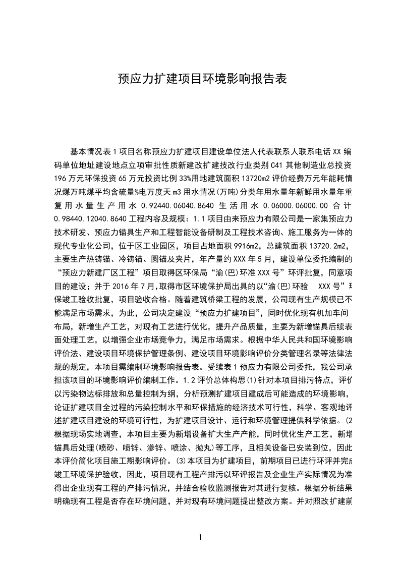 基本情况表1项目名称预应力扩建项目建设单位法人代表联系人联系电话XX编码单位地址建设地点立项审批性质新建改扩建技改行业类别C41其他制造业总投资196万元环保投资65万元投资比例33%用地建筑面积13720m2评价经费万元年能耗情况煤万吨煤平均含硫量%电万度天m3用水情况(万吨)分类年用水量年新鲜用水量年重复用水量生产用水0.92440.06040.8640生活用水0.06000.06000.00合计0.98440.12040.8640工程内容及规模:1.1项目由来预应力有限公司是一家集预应力技术研发、预应力锚具生产和工程智能设备研制及工程技术咨询、施工服务为一体的现代专业化公司,位于区工业园区,项目占地面积9916m2,总建筑面积13720.2m2,主要生产热铸锚、冷铸锚、圆锚及夹片,年产量约XXX年5月,建设单位委托编制的“预应力新建厂区工程”项目取得区环保局“渝(巴)环准XXX号”环评批复,同意项目的建设;并于2024年7月,取得市区环境保护局出具的以“渝(巴)环验XXX号”环保竣工验收批复,项目验收合格。随着建筑桥梁工程的发展,公司现有生产规模已不能满足市场需求,为此,公司决定建设“预应力扩建项目”,同时优化现有机加车间布局,新增生产工艺,对现有工艺进行优化,提升产品质量,主要为新增锚具后续表面处理工艺,以增强企业市场竞争力,满足市场需求。根据中华人民共和国环境影响评价法、建设项目环境保护管理条例、建设项目环境影响评价分类管理名录等法律法规的规定,本项目需编制环境影响报告表。受续表1预应力有限公司委托,我公司承担该项目的环境影响评价编制工作。1.2评价总体构思(1)针对本项目排污特点,评价以污染物达标排放和总量控制为纲,分析预测扩建项目建成后可能造成的环境影响,论证扩建项目全过程的污染控制水平和环保措施的经济技术可行性,科学、客观地评述扩建项目建设的环境可行性,为扩建项目设计、运行和环境管理提供科学依据。(2)根据现场实地调查,本项目主要为新增设备扩大生产产能,同时优化生产工艺,新增锚具后处理(喷砂、喷锌、渗锌、喷涂、抛丸)等工序,且相关设备已安装到位,因此,本评价简化项目施工期影响评价。(3)本项目为扩建项目,前期项目已进行环评并完成竣工环境保护验收,因此,项目现有工程产排污以环评报告及企业生产实际情况为准,得出企业现有工程的产排污情况,并结合验收监测报告对其进行复核。根据分析结果,明确现有工程是否存在环境问题,并对现有环境问题提出整改方案。并对照改扩建前后的排污情况,突出“三本账”核算。(4)根据环境影响评价技术导则地下水环境(HJ610-2024)附录A地下水环境影响评价行业分类表,扩建项目为类项目,根据评价导则规定的评价方法,本次评价采用类比分析法进行地下水评价。(5)为了解项目所在区域环境质量现状,结合项目产排污特征及区域污染源情况,环境质量采用引用现有数据及现场实测数据进行评价,其中,空气质量大气常规因子和地表水现状环境质量评价引用现有数据,大气特征因子(非甲烷总烃、二甲苯)、声环境质量和地下水环境质量进行现状实测。1.3项目概况1.3.1项目基本情况项目名称:预应力扩建项目建设单位:预应力有限公司建设地点:市区村建设性质:改扩建建筑面积:13720m2项目投资:项目总投资196万元,环保投资65万元建设内容及生产规模:现有机加区新增车床27台、铣床9台、锯床5台、钻床2台、加工中心1台、切割机4台、攻丝机2台,共计设备50台;厂区现有热处理区闲置区域新增天然气渗锌炉1台,抛丸机1台,热处理区西南侧新增后处理区,设置喷砂机1台,喷锌机1台,喷漆房1个(2个喷漆工位),烘干房1个,用于项目产品的后续处理;热处理区东侧新增焊接区1个,扩建完成后新增年产2150t产品的生产能力,其中,圆锚及夹片20冷铸锚90热铸锚25钢结构件801.3.2项目产品方案表1.3-1扩建项目新增产品及产能一览表序号产品名称规格单位数量备注1圆锚及夹片0.030.002冷铸锚0.350.003热铸锚0.170.504钢结a800150改扩建完成后本项目产品一览表。表1.3-2扩建完成后全厂产品变化一览表序号产品名称单位现有工程扩建工程建成后全厂1圆锚及夹002XXXX4002冷铸009XXXX6003热铸XXX04钢结构XXX合050XXXX3200扩建完成后,项目产品生产工艺方案详见图1.3-1。新增生产工艺新增生产工艺注:前处理为机械加工(车、钻、铣)等现有工序图1.3-1扩建完成后项目产品工艺流向图1.3.3喷涂方案根据企业提供资料,项目需喷漆产品主要为热铸锚及冷铸锚,喷漆工作时间约8h;项目油漆喷漆附着率约为40%,涂装漆膜厚度、密度及各涂层面积分别见表1.3-3。表1.3-3扩建项目喷漆方案产品单件喷涂面积(m2)喷喷涂面积(m2)底漆喷涂厚度(um)面漆喷涂厚度(um)热铸锚1.5105XXXX010XXXX3050冷铸锚2.035XXXX08010XXXX3050注:调漆后,底漆密度按1.3,面漆密度按照1.3计。1.3.4项目建设内容及项目组成本次改扩建依托机加车间进行生产,对现有机加车间布局进行调整优化,不新增占地,其主要建设内容为:为满足项目生产扩能要求,现有机加区新增车床27台、铣床9台、锯床5台、钻床2台、加工中心1台、切割机4台、攻丝机2台,共计机加设备50台;新增焊接区1个,新增二氧化碳保护焊机4台,主要用于钢结构件的焊接,年焊接钢结构件800t;现有热处理区新增天然气渗锌炉1台,抛丸机1台;设置后处理区:新增喷砂机1台,喷锌机1台,吹灰房1个,喷漆房1个(设2个喷漆工位),烘干房1个,扩