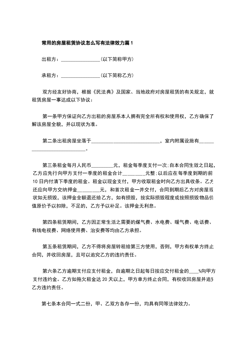 常用的房屋租赁协议怎么写有法律效力篇6