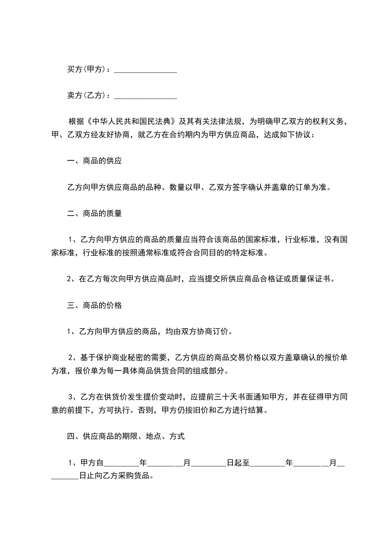 根据《中华人民共和国民法典》及其有关法律法规,为明确甲乙双方的权利义务,甲、乙双方经友好协商,就乙方在合约期内为甲方供应商品,达成如下协议: