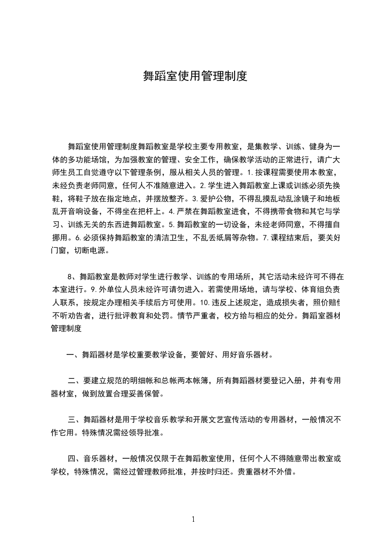 舞蹈室使用管理制度舞蹈教室是学校主要专用教室,是集教学、训练、健身为一体的多功能场馆,为加强教室的管理、安全工作,确保教学活动的正常进行,请广大师生员工自觉遵守以下管理条例,服从相关人员的管理。1.按课程需要使用本教室,未经负责老师同意,任何人不准随意进入。2.学生进入舞蹈教室上课或训练必须先换鞋,将鞋子放在指定地点,并摆放整齐。3.爱护公物,不得乱摸乱动乱涂镜子和地板,乱开音响设备,不得坐在把杆上。4.严禁在舞蹈教室进食,不得携带食物和其它与学习、训练无关的东西进舞蹈教室。5.舞蹈教室的一切设备,未经老师同意,不得擅自挪用。6.必须保持舞蹈教室的清洁卫生,不乱丢纸屑等杂物。7.课程结束后,要关好门窗,切断电源。