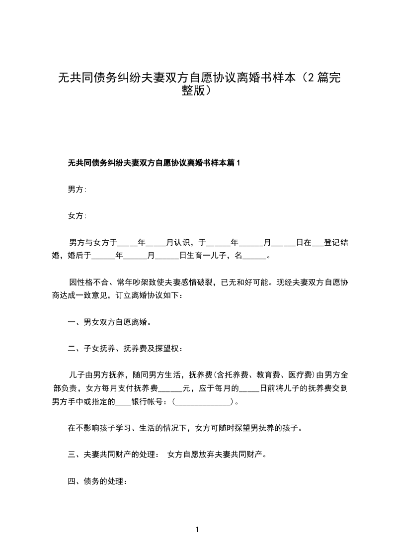 无债务纠纷夫妻自愿协议离婚书格式篇2