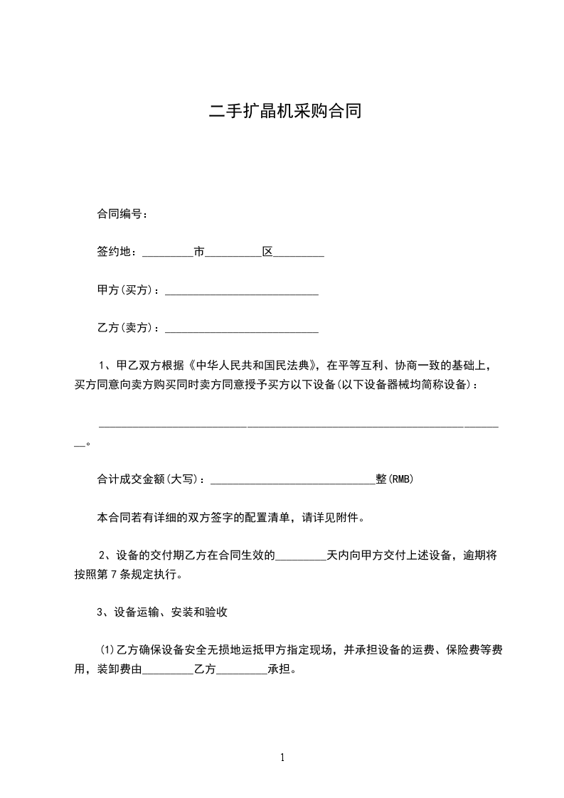2.付款方式全部设备验收合格后的_______日内,甲方向乙方支付合同总金额的即元人民币整。若延期付款,甲方每天应向乙方缴纳延期额的千分之一作为罚金。合同总金额的余款即____________元人民币作为质保金,若设备运行正常,质保金在验收完成一年后的七日内一次性无息给付。