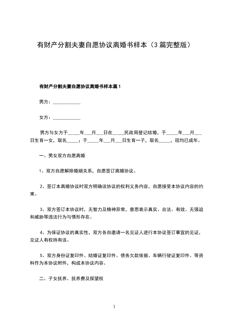有财产分割夫妻自愿协议离婚书样本篇1