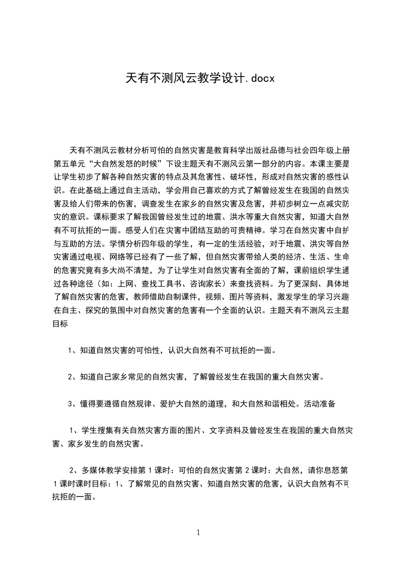 《天有不测风云》是六年级品社下册第三单元第一课,本课时的学习目的是让学生了解自然灾害的可怕及不可抗拒,了解自然灾害的危害,逐步树立保护环境的意识。