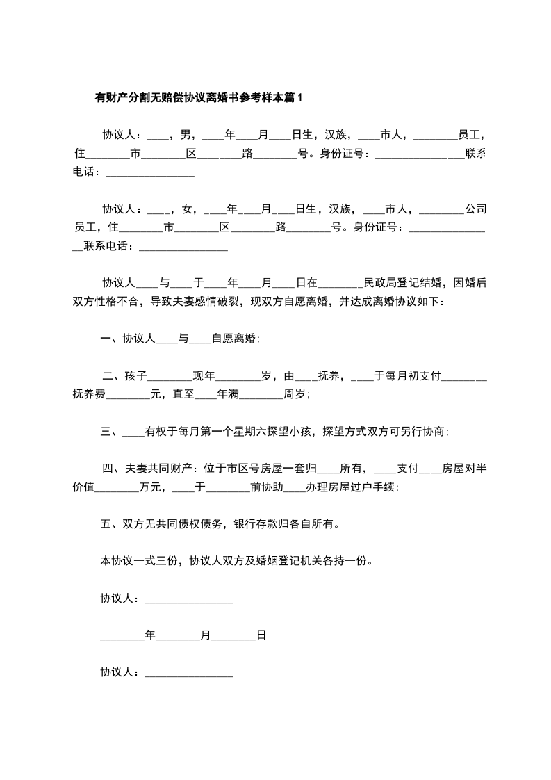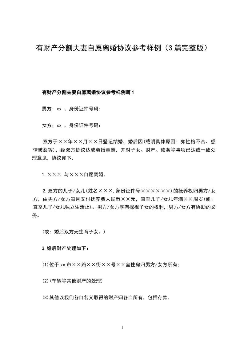 有财产分割离婚协议书参考样式篇1