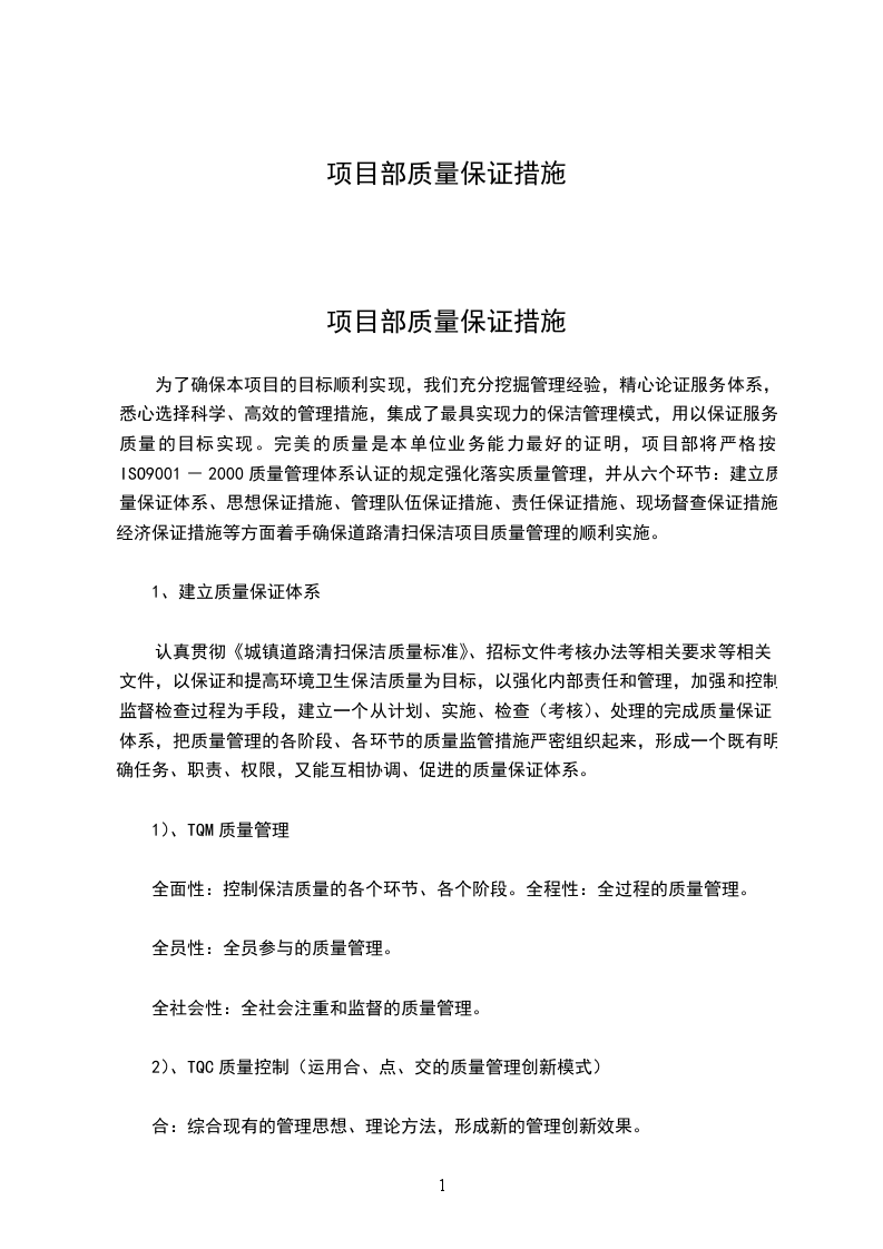 为了确保本项目的目标顺利实现,我们充分挖掘管理经验,精心论证服务体系,悉心选择科学、高效的管理措施,集成了最具实现力的保洁管理模式,用以保证服务质量的目标实现。完美的质量是本单位业务能力最好的证明,项目部将严格按ISO9001-2000质量管理体系认证的规定强化落实质量管理,并从六个环节:建立质量保证体系、思想保证措施、管理队伍保证措施、责任保证措施、现场督查保证措施、经济保证措施等方面着手确保道路清扫保洁项目质量管理的顺利实施。