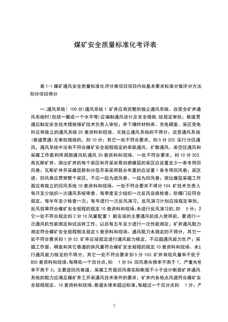 表1-1煤矿通风安全质量标准化评分表项目项目内容基本要求标准分值评分方法扣分项目得分