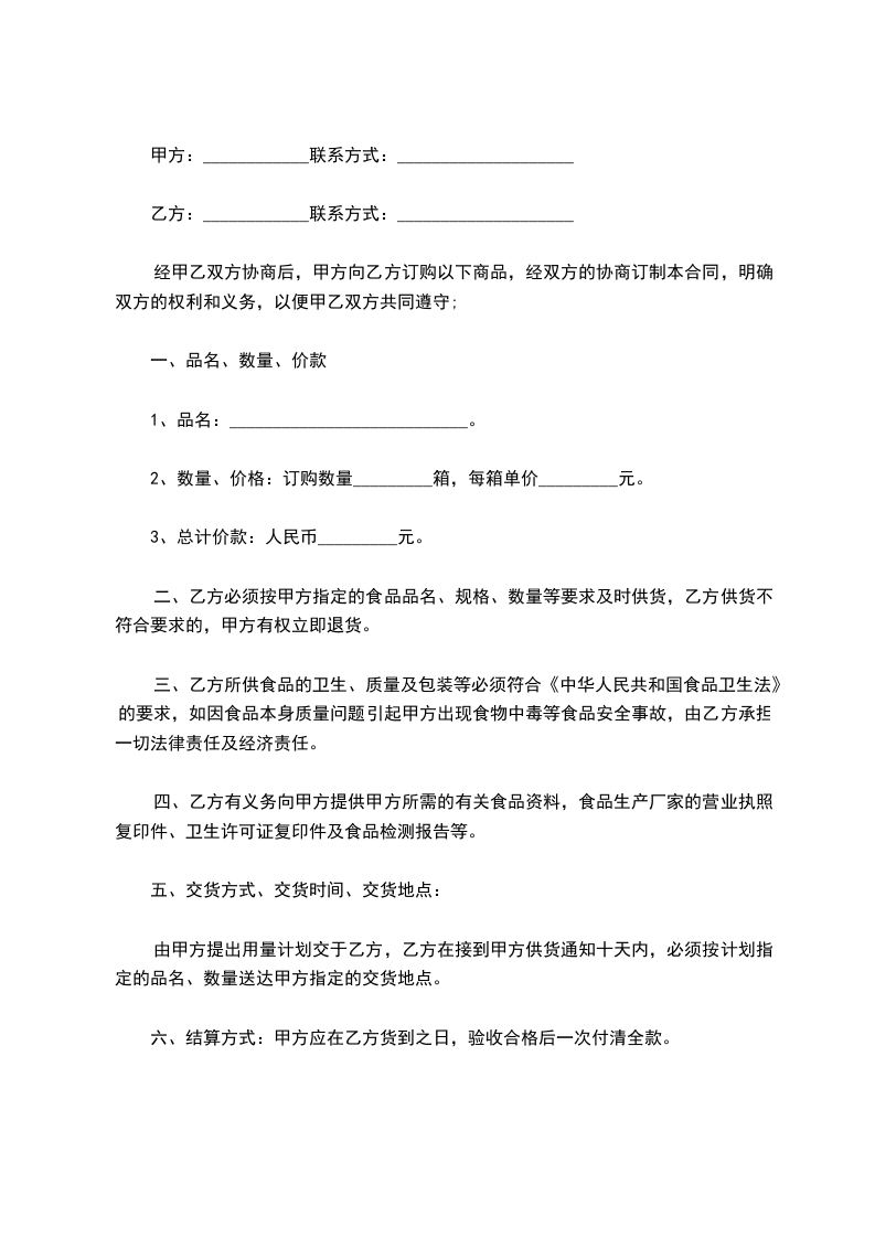 三、乙方所供食品的卫生、质量及包装等必须符合《中华人民共和国食品卫生法》的要求,如因食品本身质量问题引起甲方出现食物中毒等食品安全事故,由乙方承担一切法律责任及经济责任。