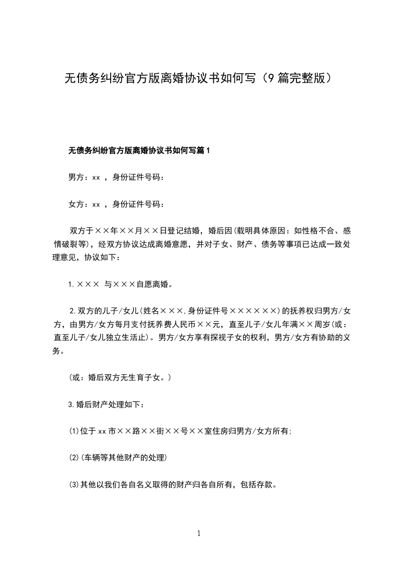 八、本协议一式三份,男、女双方各执一份,婚姻登记机关存档一份,自婚姻登记机颁发《离婚证》之日起生效。九、如本协议生效后在执行中发生争议的,双方应协商解决,协商不成,任何一方均可向相关人民法院起诉。