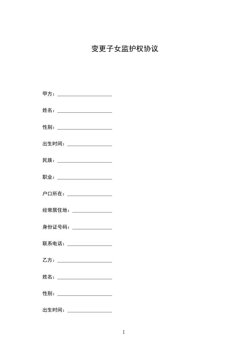 甲、乙双方原是夫妻。__________年__________月__________日生育__________子/女,名__________,现年__________岁,读__________。__________年__________月__________日,经__________法院审理查明,甲、乙双方因感情破裂而被判决离婚,子/女随乙方生活,甲方每月给抚养费__________元至子/女独立生活为止。由于乙方情况发生变化(请说明原因),双方同意变更监护方式。