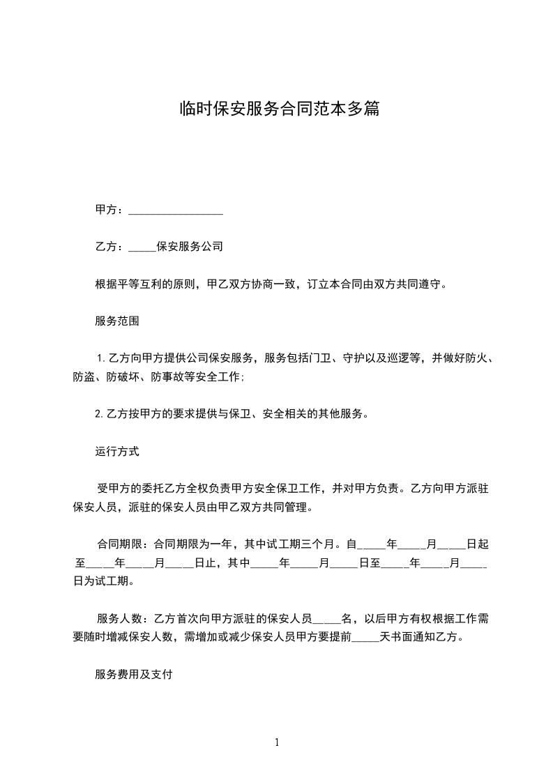 1.乙方向甲方提供公司保安服务,服务包括门卫、守护以及巡逻等,并做好防火、防盗、防破坏、防事故等安全工作;
