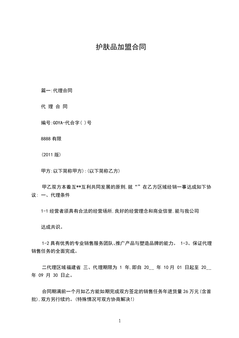 二代理区域福建省 三、代理期限为 1 年,即自 20__ 年 10月 01 日起至 20__ 年 09 月 30 日止。