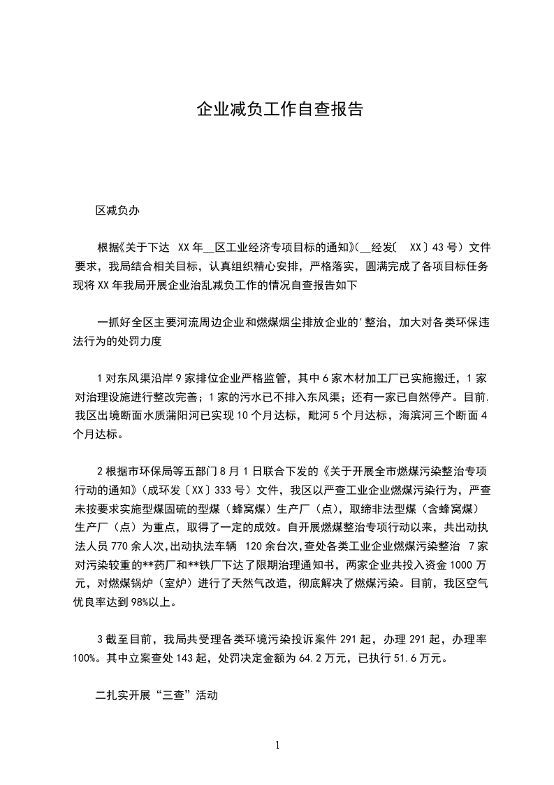 根据《关于下达XX年__区工业经济专项目标的通知》(__经发〔XX〕43号)文件要求,我局结合相关目标,认真组织精心安排,严格落实,圆满完成了各项目标任务。现将XX年我局开展企业治乱减负工作的情况自查报告如下