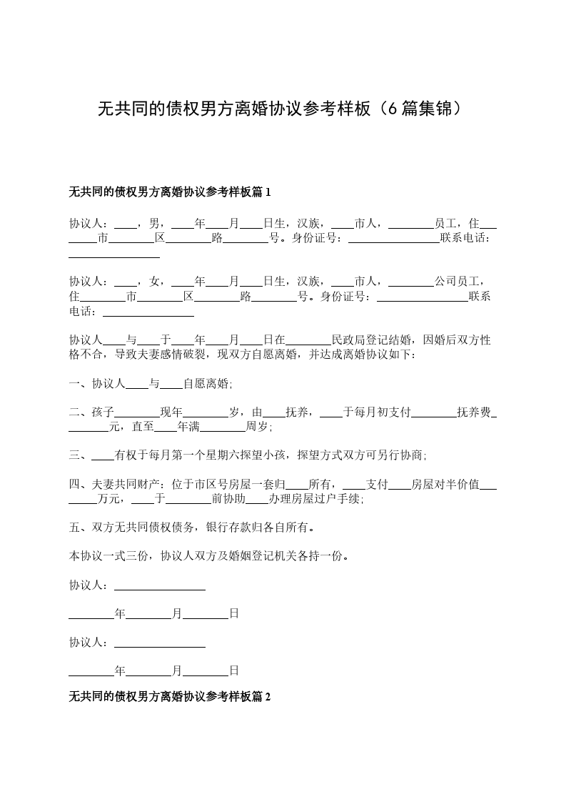 无共同的债权男方离婚协议参考样板篇6
