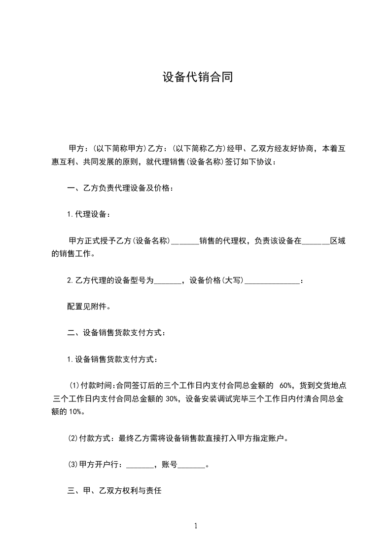 甲方:(以下简称甲方)乙方:(以下简称乙方)经甲、乙双方经友好协商,本着互惠互利、共同发展的原则,就代理销售(设备名称)签订如下协议: