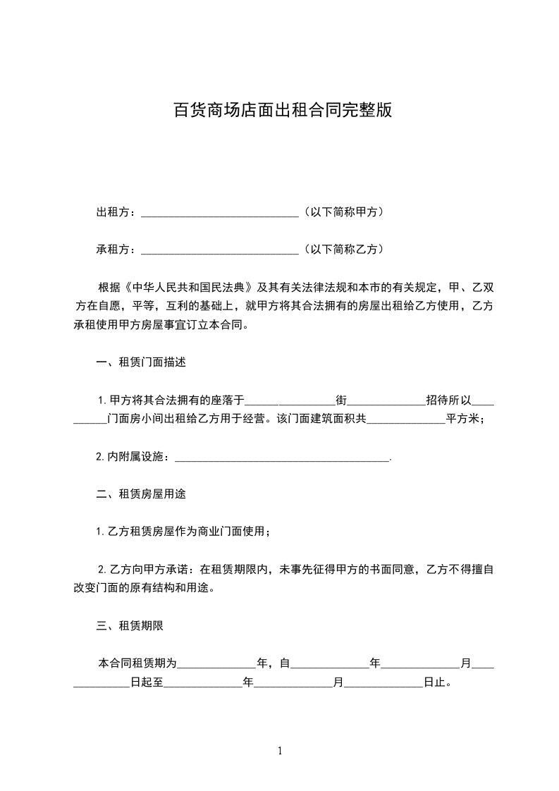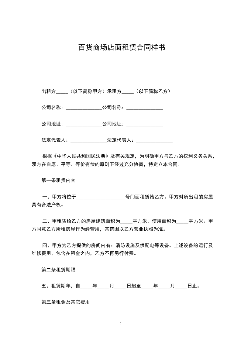 1.甲方将其合法拥有的座落于________________街______________招待所以__________门面房小间出租给乙方用于经营。该门面建筑面积共______________平方米;