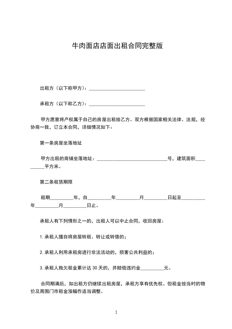 一、甲方将位于_______________________号门面租赁给乙方。甲方对所出租的房屋具有合法产权。