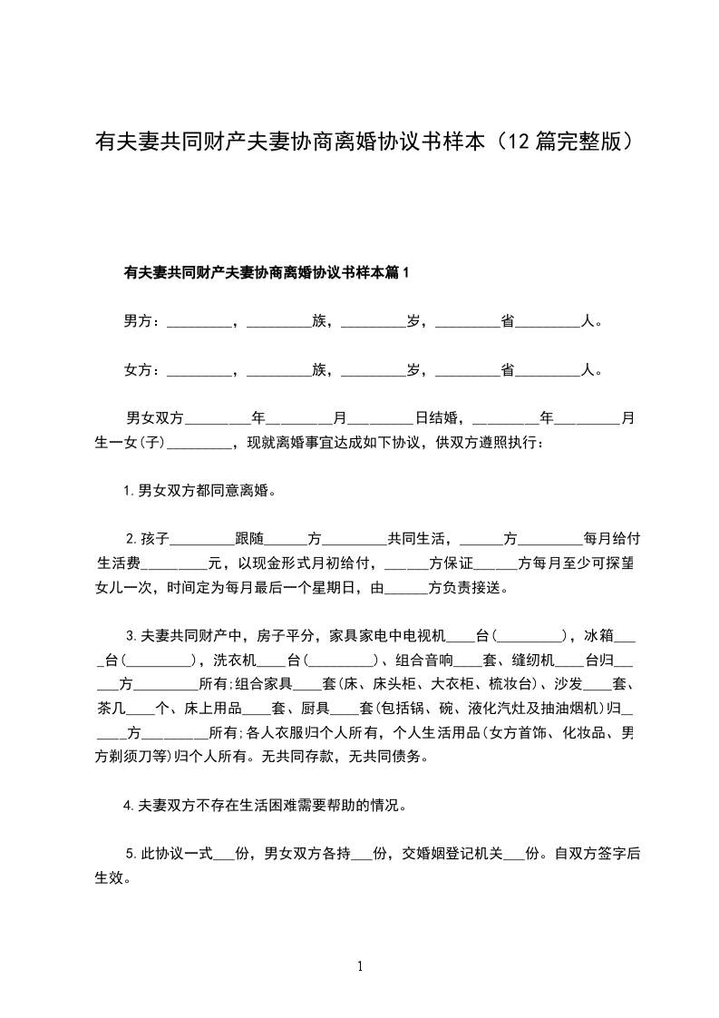 男方_________与女方_________现因夫妻感情彻底破裂自愿离婚,经双方商定,对有关事项达成以下协议: