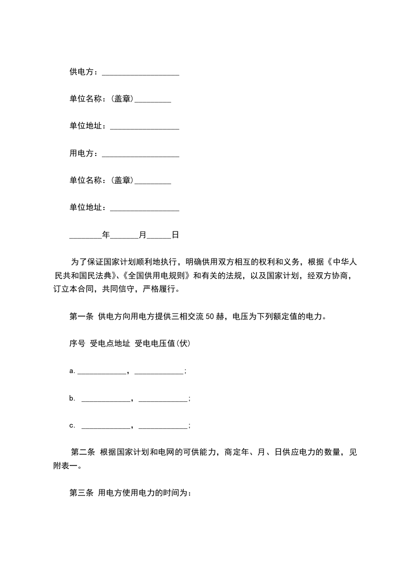 第一条 供电方向用电方提供三相交流50赫,电压为下列额定值的电力。