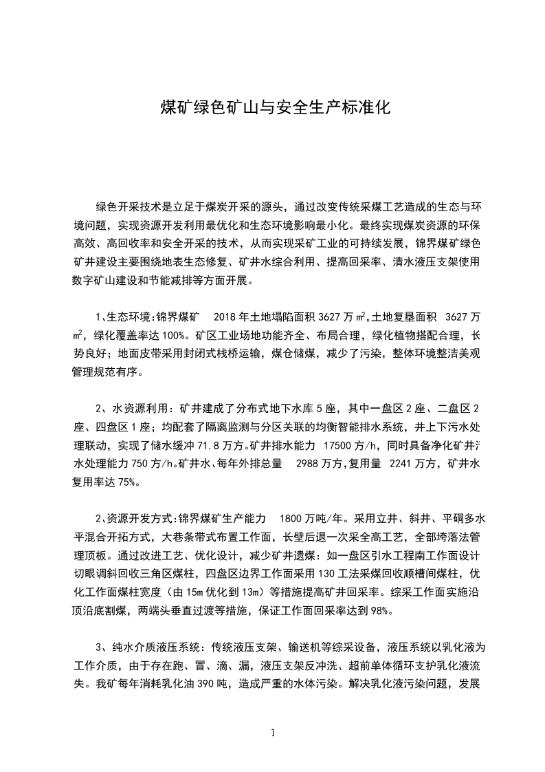 绿色开采技术是立足于煤炭开采的源头,通过改变传统采煤工艺造成的生态与环境问题,实现资源开发利用最优化和生态环境影响最小化。最终实现煤炭资源的环保、高效、高回收率和安全开采的技术,从而实现采矿工业的可持续发展,锦界煤矿绿色矿井建设主要围绕地表生态修复、矿井水综合利用、提高回采率、清水液压支架使用、数字矿山建设和节能减排等方面开展。