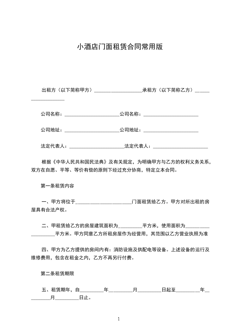一、甲方将位于_______________________门面租赁给乙方。甲方对所出租的房屋具有合法产权。