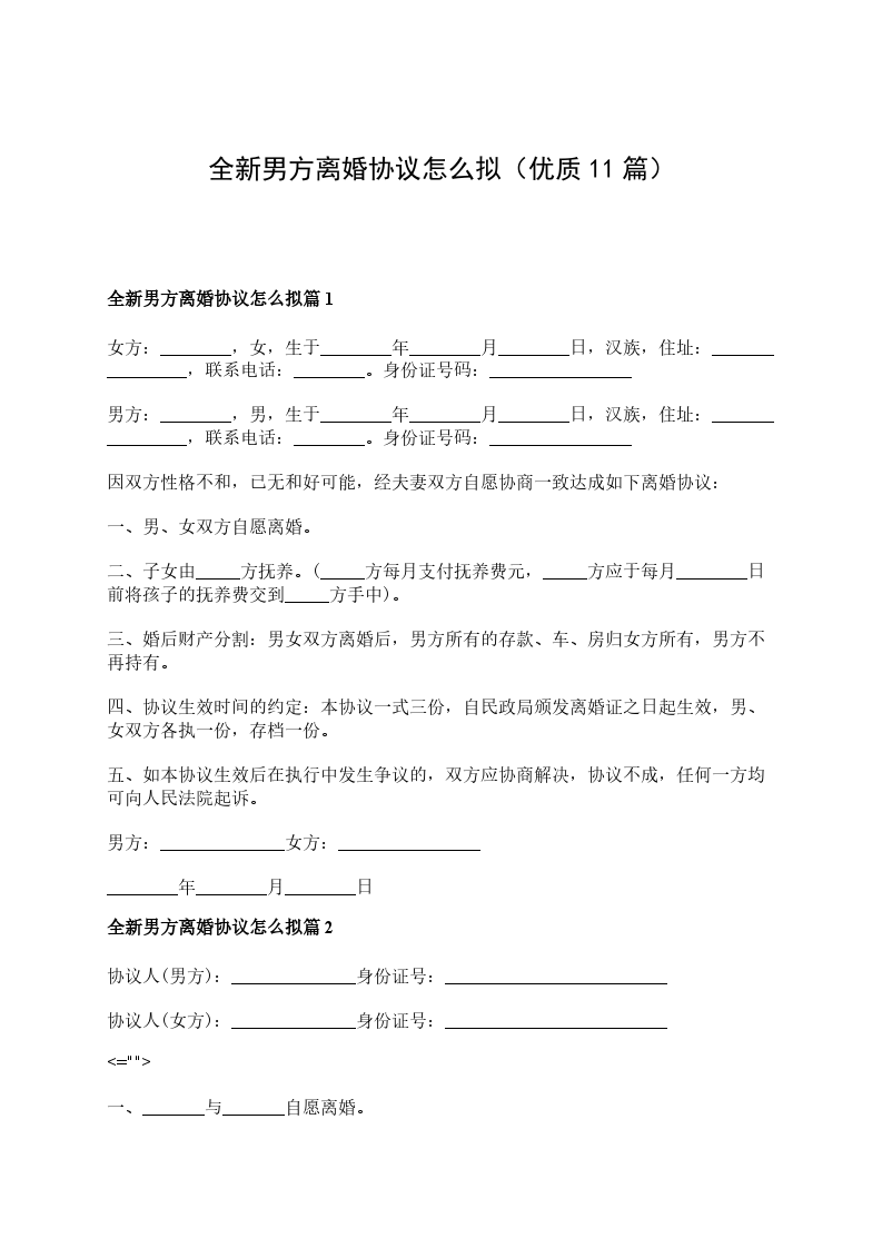 全新男方协议离婚范本参考样板篇11