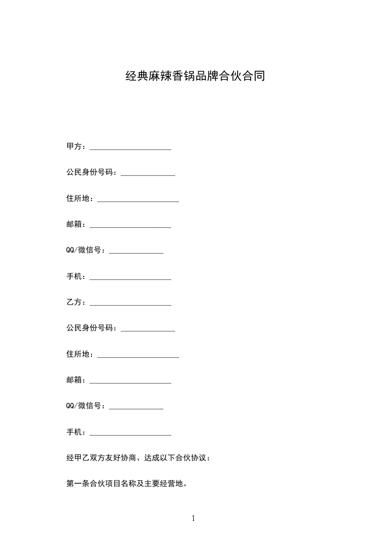 麻辣香锅品牌合资合同