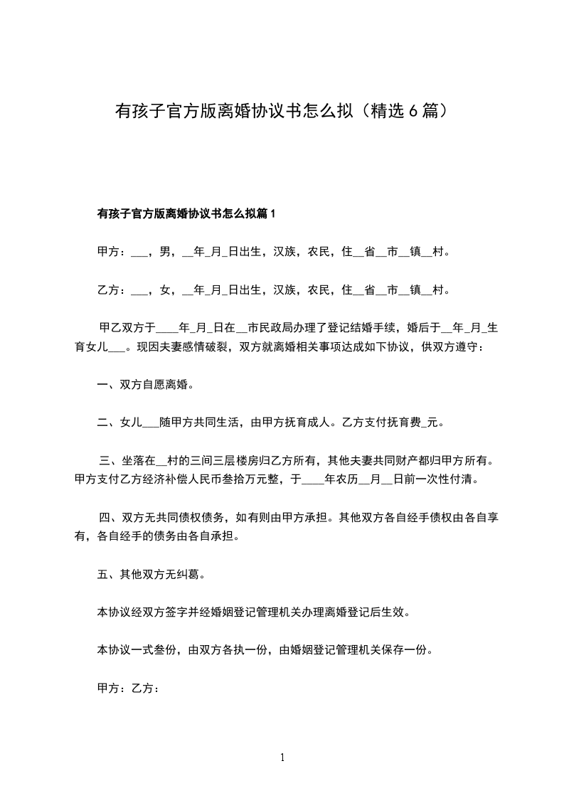 双方于________年________月________日在________________人民政府的民政部门登记结婚,婚后一个子女,因双方性格不和,无法共同生活,自愿离婚,经双方协商一致,订立离婚协议如下: