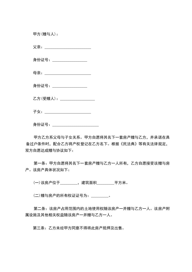 甲方乙方系父母与子女关系。甲方自愿将其名下一套房产赠与乙方,并承诺在具备过户条件时,配合乙方将产权登记在乙方名下。根据《民法典》等有关法律规定,双方自愿达成赠与协议如下: