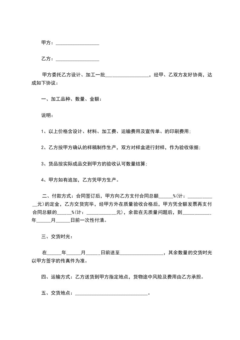 甲方委托乙方设计、加工一批__________________,经甲、乙双方友好协商,达成如下协议: