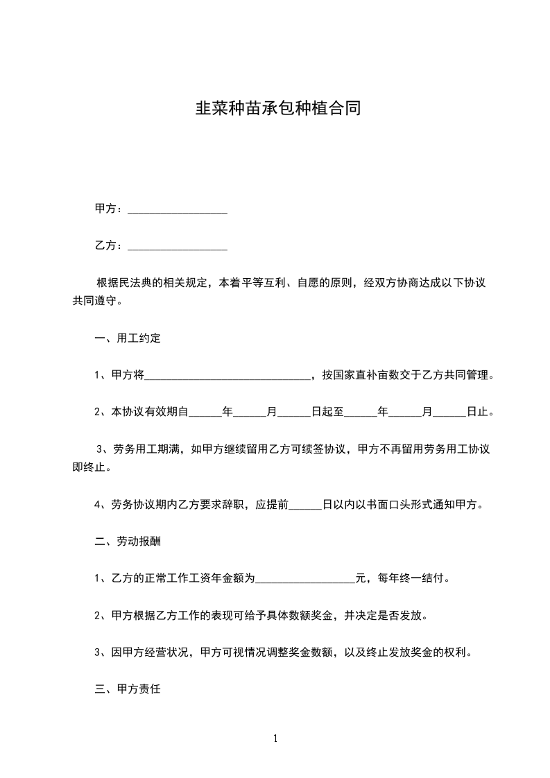 韭菜种苗承包种植合同