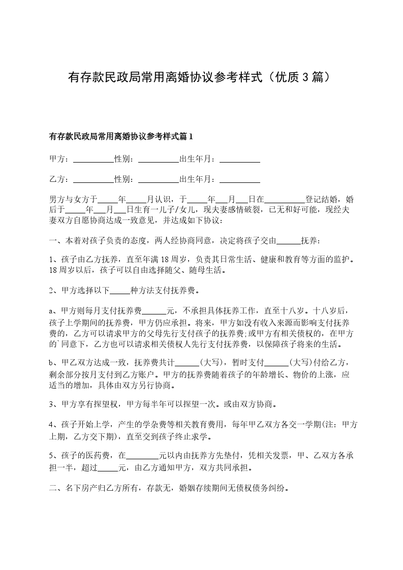 有存款民政局协议离婚书参考样式篇3