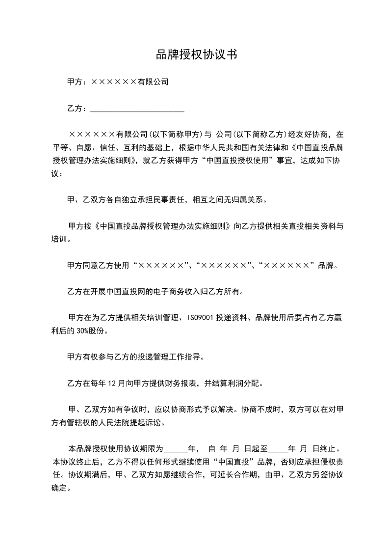 ××××××有限公司(以下简称甲方)与 公司(以下简称乙方)经友好协商,在平等、自愿、信任、互利的基础上,根据中华人民共和国有关法律和《中国直投品牌授权管理办法实施细则》,就乙方获得甲方“中国直投授权使用”事宜,达成如下协议: