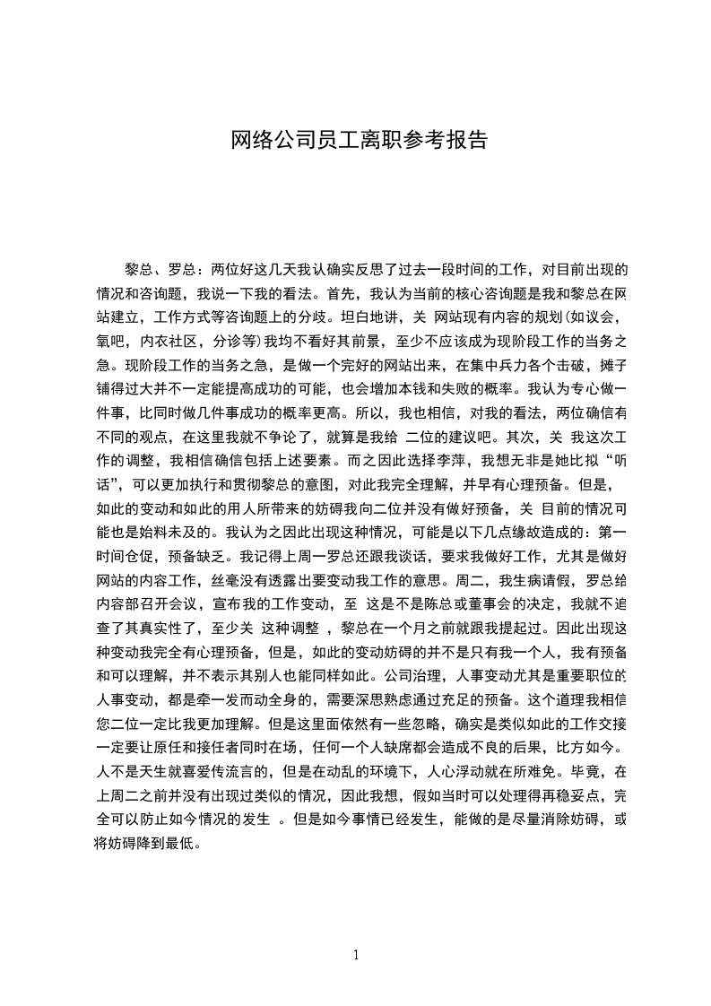 黎总、罗总:两位好这几天我认确实反思了过去一段时间的工作,对目前出现的情况和咨询题,我说一下我的看法。首先,我认为当前的核心咨询题是我和黎总在网站建立,工作方式等咨询题上的分歧。坦白地讲,关 网站现有内容的规划(如议会,氧吧,内衣社区,分诊等)我均不看好其前景,至少不应该成为现阶段工作的当务之急。现阶段工作的当务之急,是做一个完好的网站出来,在集中兵力各个击破,摊子铺得过大并不一定能提高成功的可能,也会增加本钱和失败的概率。我认为专心做一件事,比同时做几件事成功的概率更高。所以,我也相信,对我的看法,两位确信有不同的观点,在这里我就不争论了,就算是我给 二位的建议吧。其次,关 我这次工作的调整,我相信确信包括上述要素。而之因此选择李萍,我想无非是她比拟“听话”,可以更加执行和贯彻黎总的意图,对此我完全理解,并早有心理预备。但是,如此的变动和如此的用人所带来的妨碍我向二位并没有做好预备,关 目前的情况可能也是始料未及的。我认为之因此出现这种情况,可能是以下几点缘故造成的:第一:时间仓促,预备缺乏。我记得上周一罗总还跟我谈话,要求我做好工作,尤其是做好网站的内容工作,丝毫没有透露出要变动我工作的意思。周二,我生病请假,罗总给内容部召开会议,宣布我的工作变动,至 这是不是陈总或董事会的决定,我就不追查了其真实性了,至少关 这种调整 ,黎总在一个月之前就跟我提起过。因此出现这种变动我完全有心理预备,但是,如此的变动妨碍的并不是只有我一个人,我有预备和可以理解,并不表示其别人也能同样如此。公司治理,人事变动尤其是重要职位的人事变动,都是牵一发而动全身的,需要深思熟虑通过充足的预备。这个道理我相信您二位一定比我更加理解。但是这里面依然有一些忽略,确实是类似如此的工作交接,一定要让原任和接任者同时在场,任何一个人缺席都会造成不良的后果,比方如今。人不是天生就喜爱传流言的,但是在动乱的环境下,人心浮动就在所难免。毕竟,在上周二之前并没有出现过类似的情况,因此我想,假如当时可以处理得再稳妥点,完全可以防止如今情况的发生 。但是如今事情已经发生,能做的是尽量消除妨碍,或将妨碍降到最低。