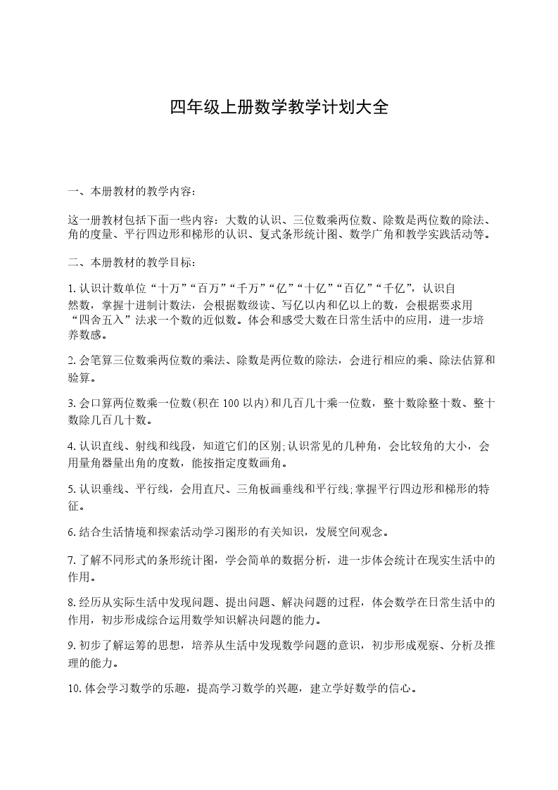 这一册教材包括下面一些内容:大数的认识、三位数乘两位数、除数是两位数的除法、角的度量、平行四边形和梯形的认识、复式条形统计图、数学广角和教学实践活动等。