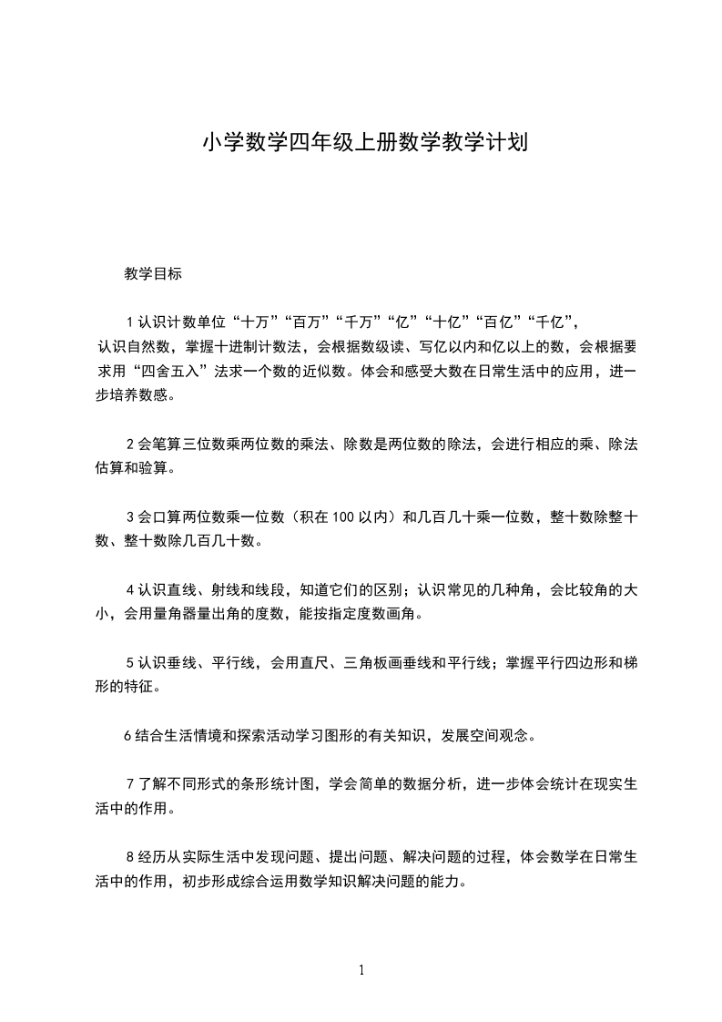 在数与计算方面,这一册教材安排了大数的认识,三位数乘两位数,除数是两位数的除法。在小学阶段,本学期结束后,有关正整数的认识和计算的内容将全部教学完。