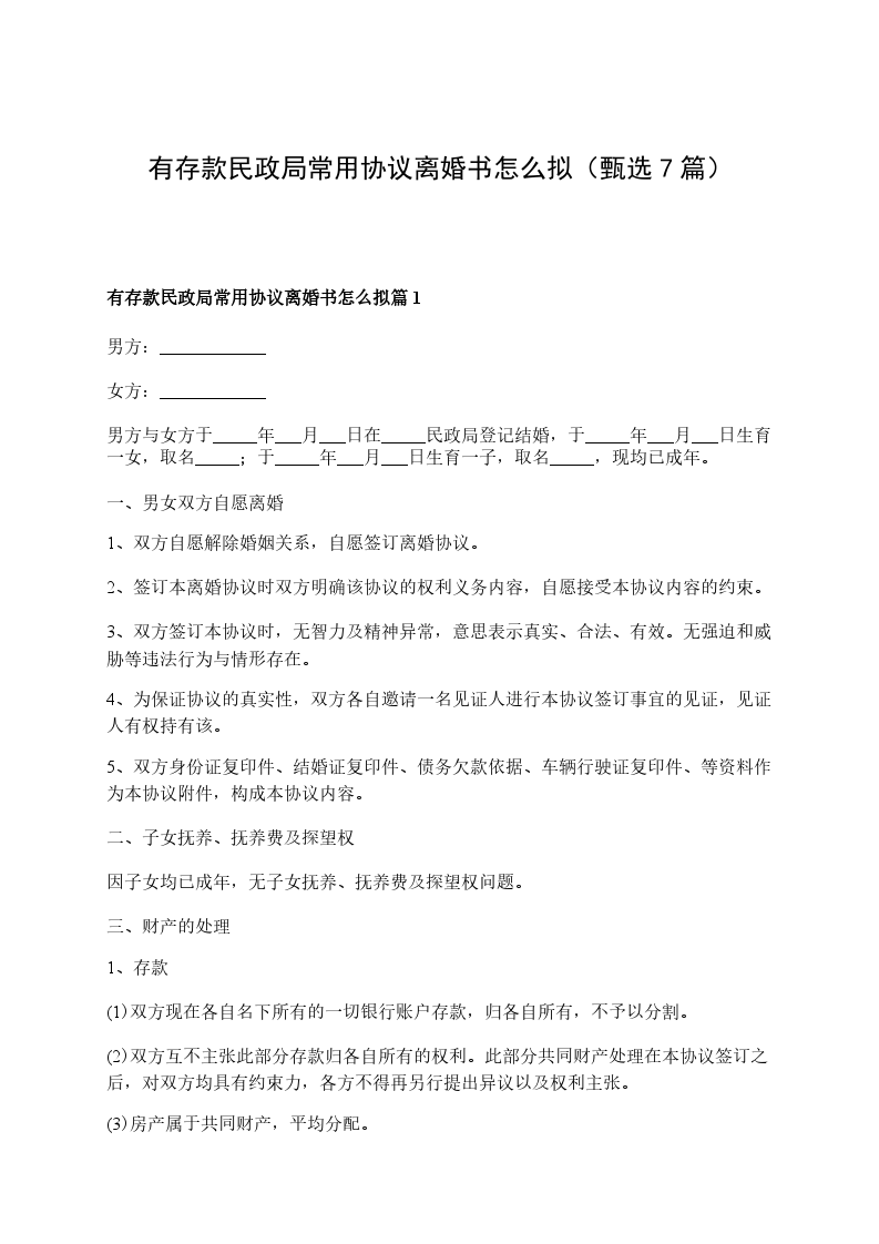 1.存款:双方名下现有银行存款共元,双方各分一半,为元。分配方式:各自名下的存款保持不变,但男方/女方应于年月日前一次性支付元给女方/男方。