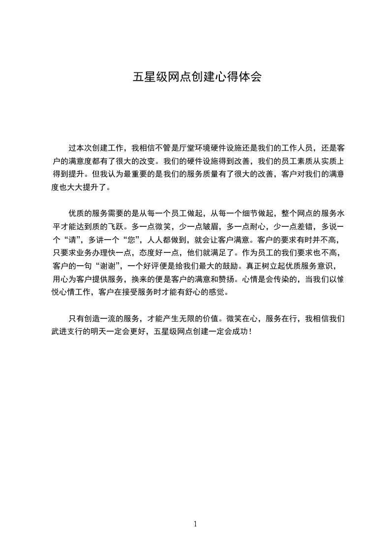 只有创造一流的服务,才能产生无限的价值。微笑在心,服务在行,我相信我们武进支行的明天一定会更好,五星级网点创建一定会成功!
