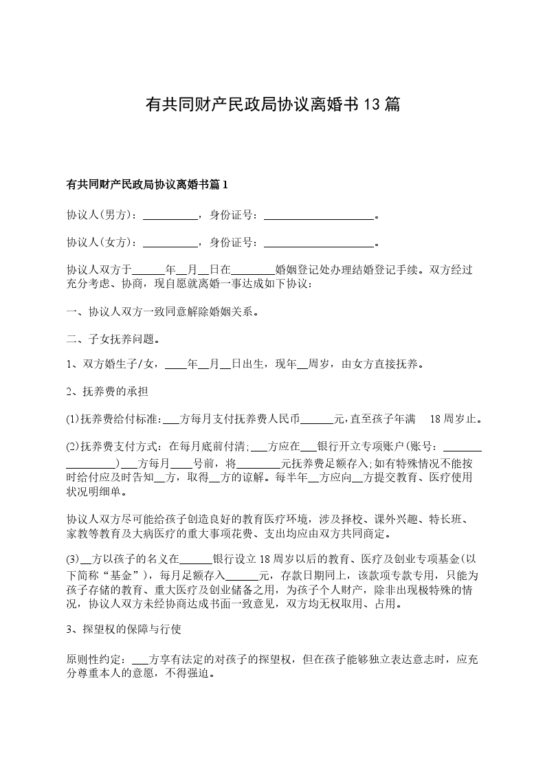 1、存款:双方名下现有银行存款共______元,双方各分一半,为______元。分配方式:各自名下的存款保持不变,但男方/女方应于_____年____月____日前一次性支付_____元给女方/男方。