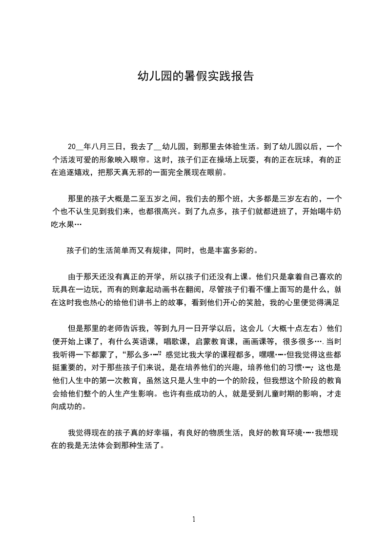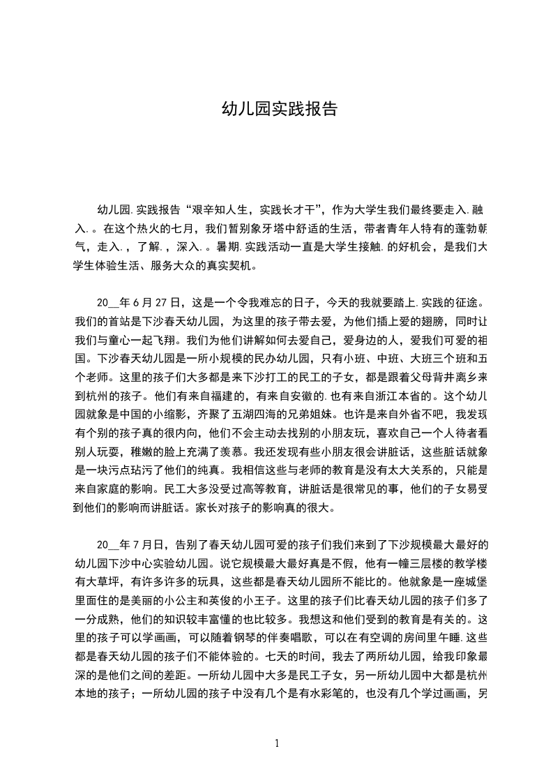 6天的大学生社会实践时间就在指缝中流走了,在上海___ 园,给我的东西实在是很多很多,酸甜苦辣,幼儿的笑脸,幼儿的泪花,幼儿的纯与真,老师的付出与回报,工作的苦与累,挫折感与成就感,这些都逐渐在我本来有点浮躁的心灵内沉淀,发酵成一种不能用纸笔所形容的感动。