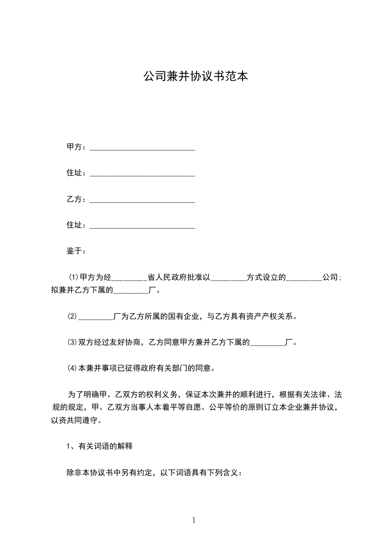 (1)甲方为经_________省人民政府批准以_________方式设立的_________公司;拟兼并乙方下属的_________厂。