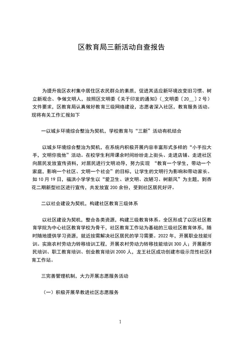 为提升我区农村集中居住区农民群众的素质,促进其适应新环境改变旧习惯、树立新观念、争做文明人,按照区文明委《关于印发的通知》(_文明委〔20__〕2号)文件要求,区教育局认真做好教育三级网络建设,志愿者深入社区,教育服务活动。现将有关工作汇报如下