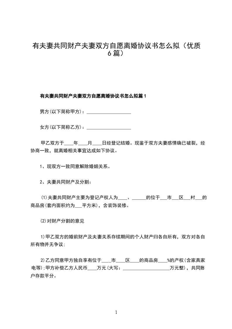 2、【房产】双方有夫妻共同财产座落在××路××小区××室商品房一套,价值人民币×××××万元,现协商归男方/女方所有,由男方/女方一次性给付男方/女方现金×××××万元,此款在本协议签订后的××天内付清;此房内的家用电器及家俱归男方/女方所有。
