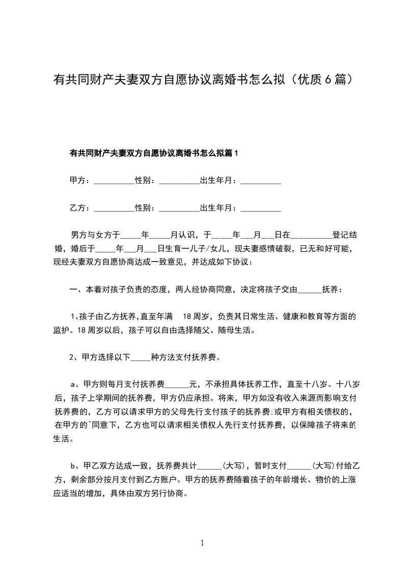 一、______与______自愿离婚。