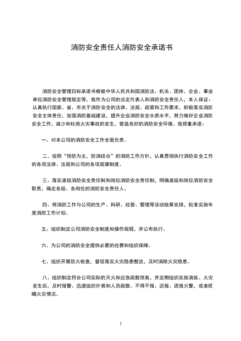 消防安全管理目标承诺书根据中华人民共和国消防法、机关、团体、企业、事业单位消防安全管理规定等,我作为公司的法定代表人和消防安全责任人,本人保证:认真执行国家、省、市关于消防安全的法律、法规、政策和工作要求,积极落实消防安全主体责任,加强消防基础建设,提升企业消防安全水质水平,努力做好企业消防安全工作,减少和杜绝火灾事故的发生,营造良好的消防安全环境。我郑重承诺: