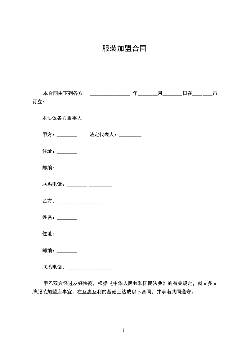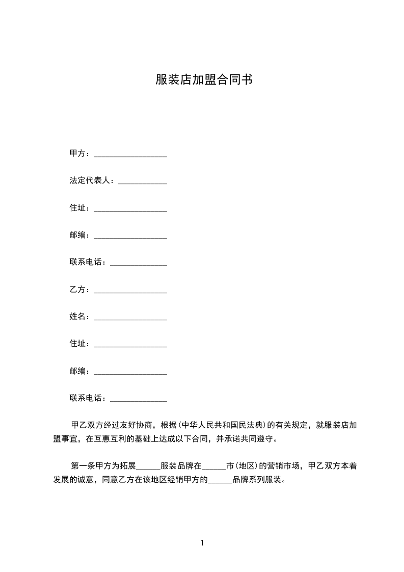 服装加盟申请表范本